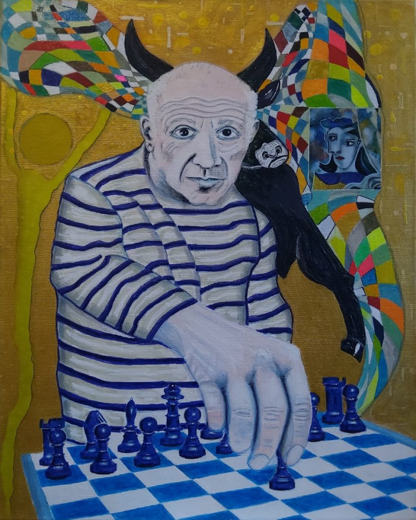 Das Bild „Schach spielender Picasso“ (Variante I+II) von Kurt Berlo zeigt eine situative Kuriosität, mit der der weltberühmte Pablo Picasso üblicherweise gar nicht in Verbindung gebracht wird. Es ist noch nicht einmal bekannt, ob der gebürtige Spanier, der in seiner Freizeit eher den Stierkampf liebte, das Schachspiel überhaupt aktiv ausübte. Deshalb ist das Gemälde, das Kurt Berlo im Jahr 2023, also 50 Jahre nach Picassos Tot anfertigte, eher als reine Fiktion zu verstehen. Gleichwohl hat sich Picasso auch in einem seiner berühmten Werke mit dem Schachspiel auseinandergesetzt. Im Jahr 1911 entstand das Bild „Das Schachspiel“, das Picasso während seiner kubistischen Periode schuf. Das hier zu besprechende Gemälde „Schach spielender Picasso“ bietet auch vor diesem Hintergrund eine Vielzahl von Interpretationsmöglichkeiten. Dabei lassen sich die metaphorischen Implikationen des Schachspiels durchaus auf die Arbeits- und Lebensweise von Picasso übertragen und geben Einblick in seine Persönlichkeit und seine Kunst. Berlos Bild enthält darüber hinaus mehrere subtil gesetzte Deutungshinweise auf das Leben und Werk von Picasso. Doch zunächst stehen die bekannten Insignien aus Picassos Welt im Vordergrund. So trägt Picasso hier einen seiner bekannten blau-weiß gestreiften Pullover, das Marinière oder Trikot Rayé, das legendäre Kleidungsstück der Bretagne schlechthin. Es war jahrhundertelang die Arbeitskleidung der dortigen Küstenfischer und gehörte zu Picassos Lieblingsstücken. Sehr markant und mit einer sichtbaren optischen Verzerrung tritt seine rechte Hand deutlich in den Bildvordergrund. Das heißt, wir sehen als Hauptmotivbestandteil des Bildes eine Hand, die mit einem fast manischen Schaffensdrang insgesamt über 50.000 Kunstwerke hervorgebracht hat. Übrigens: Sehr oft wird behauptet, Pablo Picasso sei Linkshänder gewesen. Dafür gibt es aber keine wirklich glaubhaften Belege. Auf allen Fotos sieht man ihn nämlich mit rechts malen.